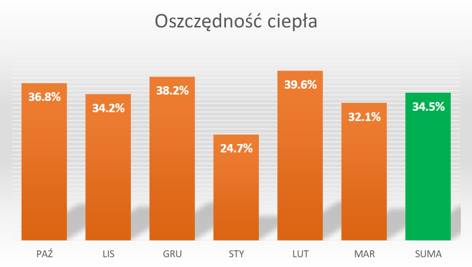 Spłynęły do nas wyczekiwane dane o zużyciu i kosztach ciepła. Zestawiliśmy je z modelami pogodowymi, a nasi specjaliści ciepłownicy, wykorzystując swoją tajemną wiedzę, przeprowadzili pierwsze analizy. Wywnioskowali z nich, że instalacje systemu Nexo przyniosły oszczędności w zużyciu ciepła na poziomie od 12 do nawet 34,5% w porównaniu z zużyciem z okresów sprzed instalacji systemu.